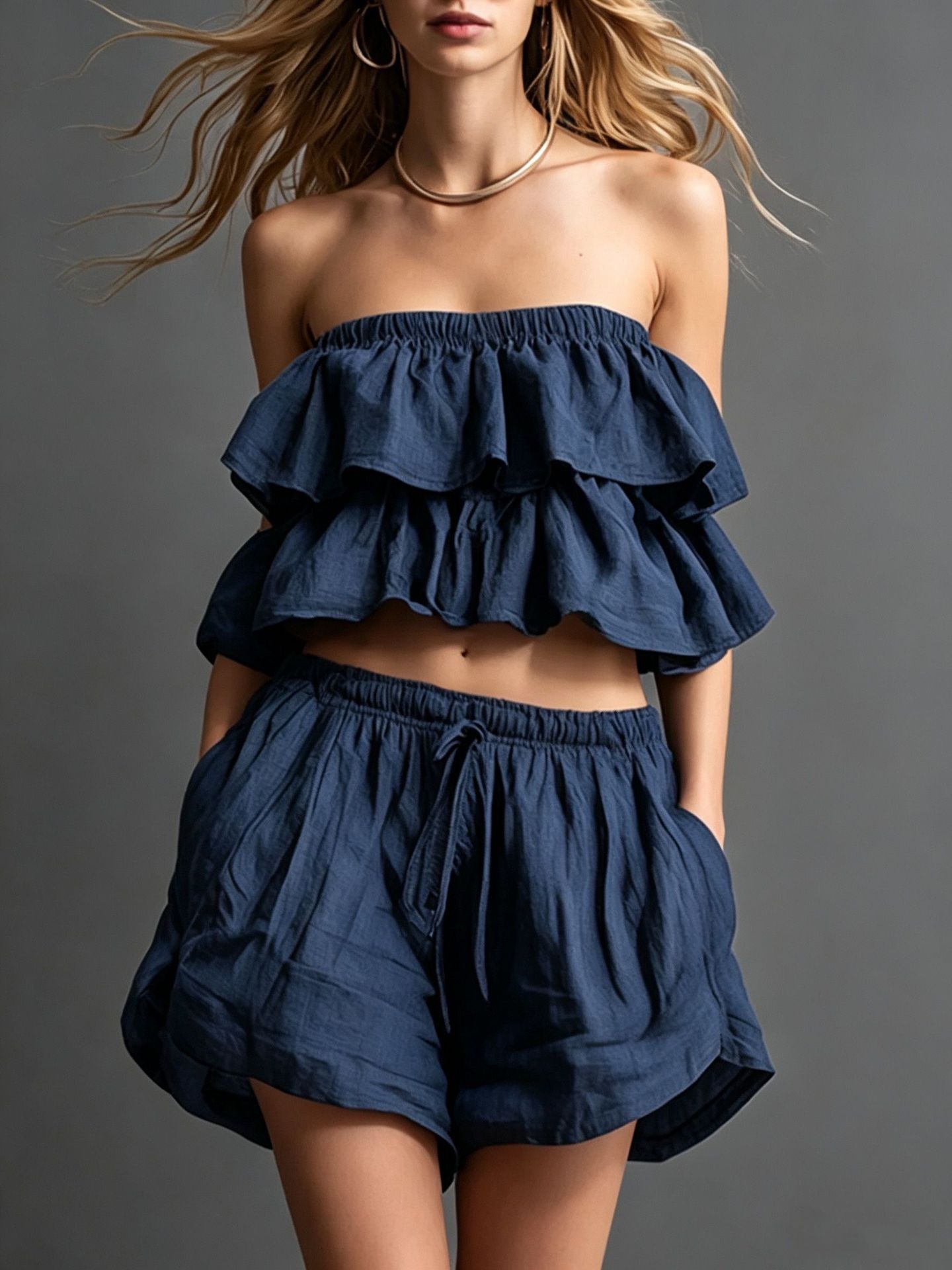 Womens Cotton-Linen Ruffle-Trimmed Strapless Shorts Set
